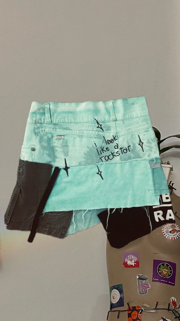 Falda intervenida con pintura+bordado+apliques con cinta reflectiva y cadenas como accesorio
